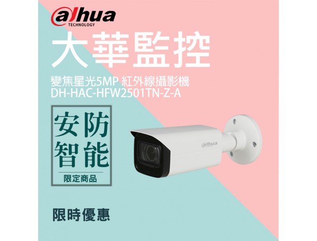 【大華dahua】變焦星光5MP HDCVI紅外線攝影機(DH-HAC-HFW2501TN-Z-A) - NT 7,600 ◆星光級0.005Lux,有效提升影像夜視效果,120dB真實寬動態 ◆2.7~13.5mm自動對焦伸縮鏡頭,3D專業降噪技術 ◆DC12V±30%寬電壓設計,可降低電源突波所造成的損壞 ◆Smart IR獨特智慧型紅外線,夜間亮度均勻,防止影像曝光 ◆CVI、AHD、TVI、CVBS影像訊號輸出(指撥開關切換) ◆1路聲音輸入與內建麥克風,音源與影像同一條線纜傳輸 ◆紅外線距離80M,IP67防水等級 相關連結 內容 【大華dahua】變焦星光5MP HDCVI紅外線攝影機(DH-HAC-HFW2501TN-Z-A)