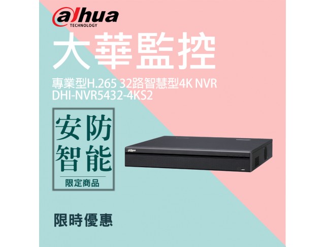 【大華dahua】專業型H.265 32路智慧型4K NVR(DHI-NVR5432-4KS2)